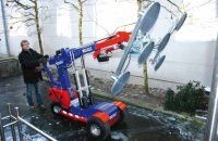 The KS600 Offroad site robot is designed for lifting, carrying, and manipulating glass and window items of up to 600kgs on site or within factories. The Offroad wheels assist with navigating uneven ground.